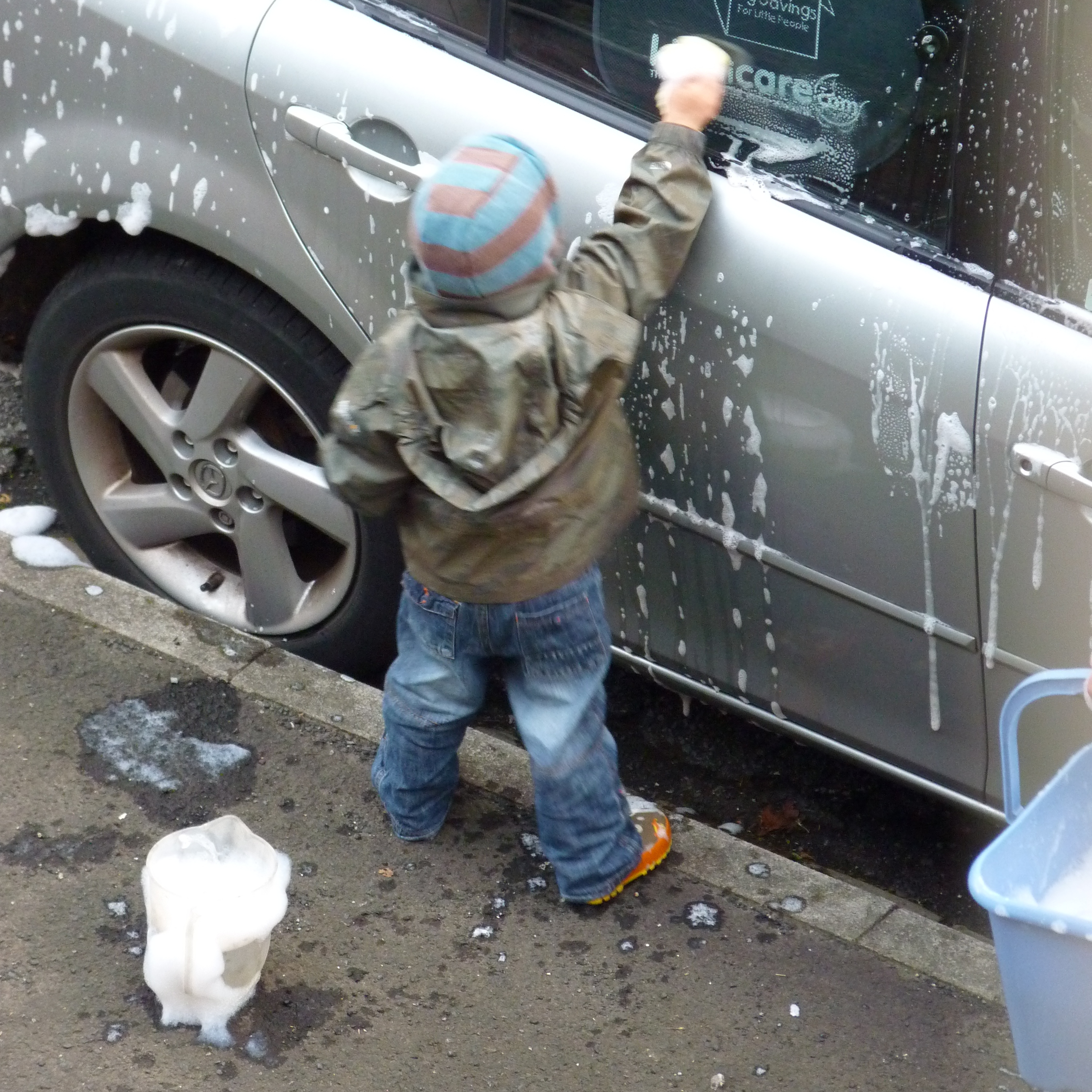 He will be 3 this Christmas, so he is turning into a proper little boy. He spent Saturday afternoon outside washing the car with Hubbie. He loved it, getting wet and soapy (and cold – it was bitter on Saturday).