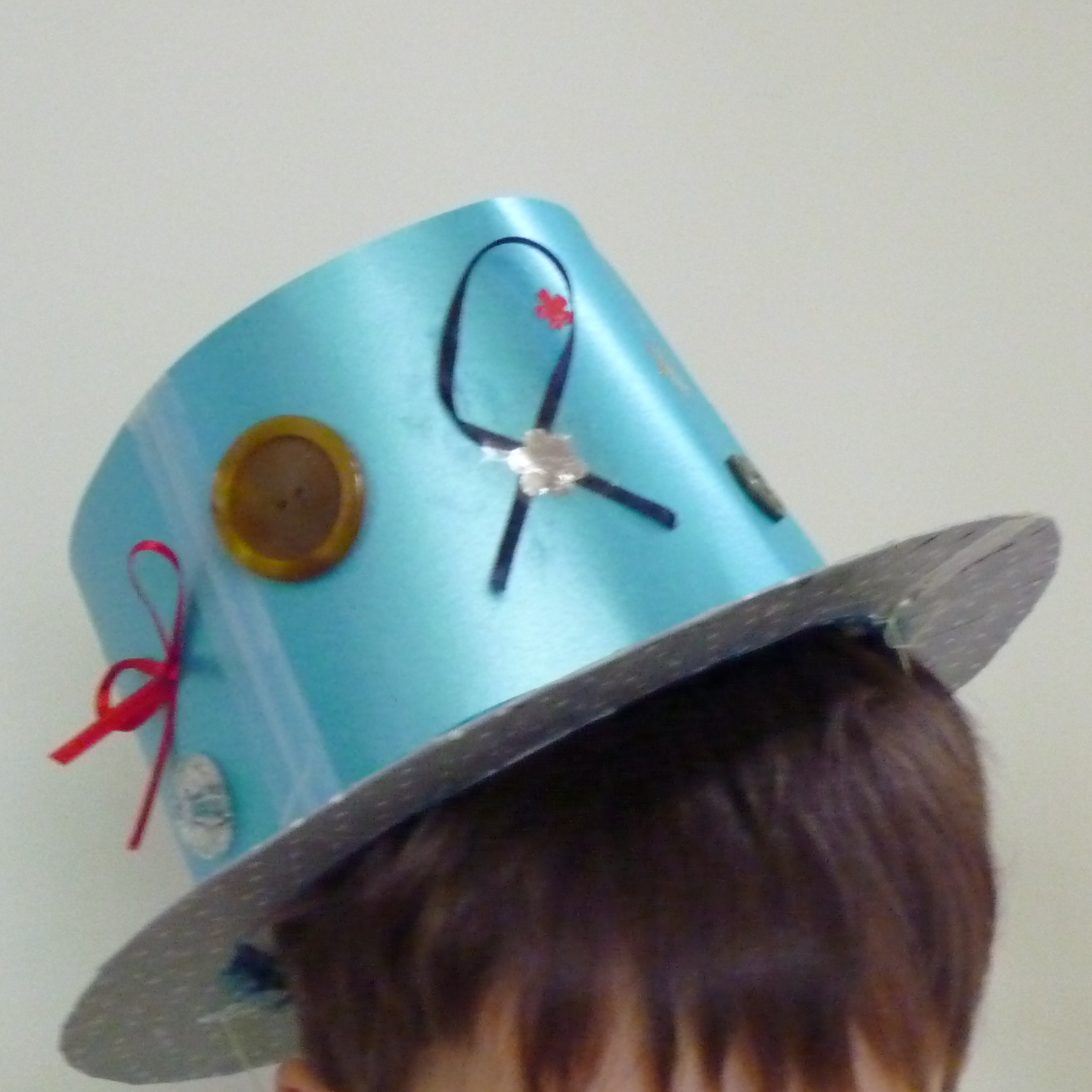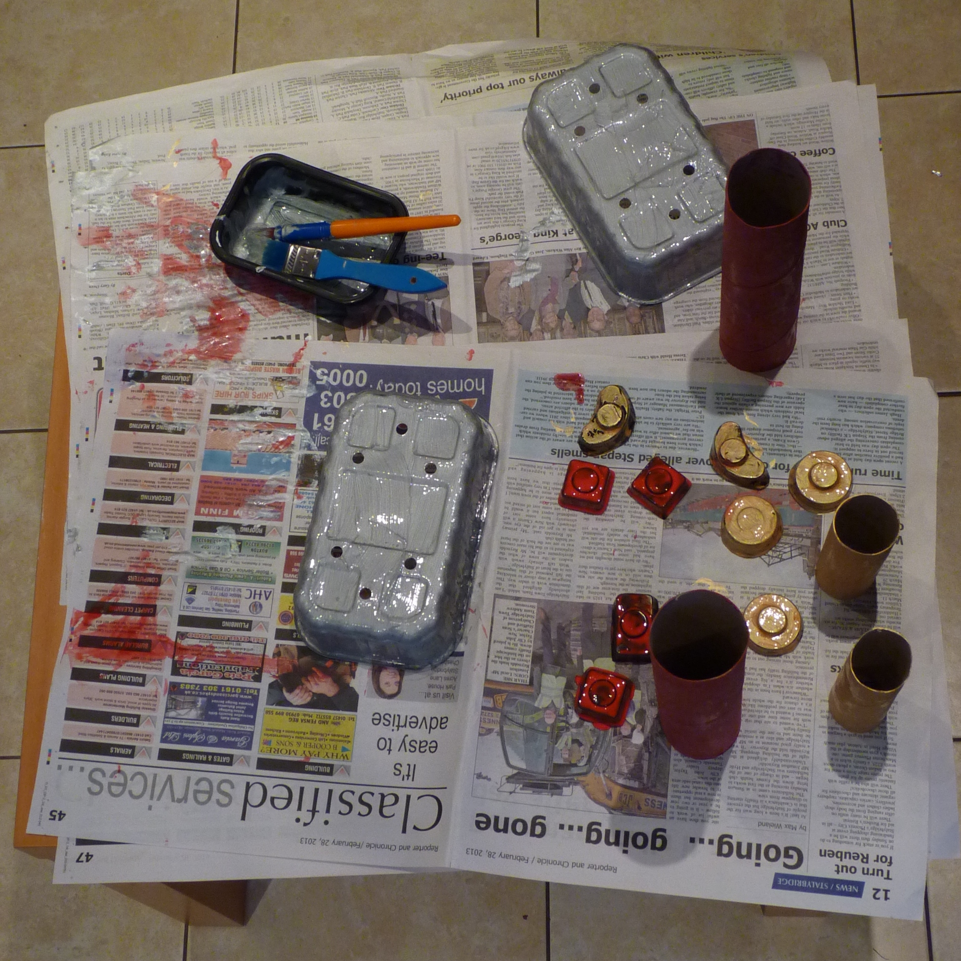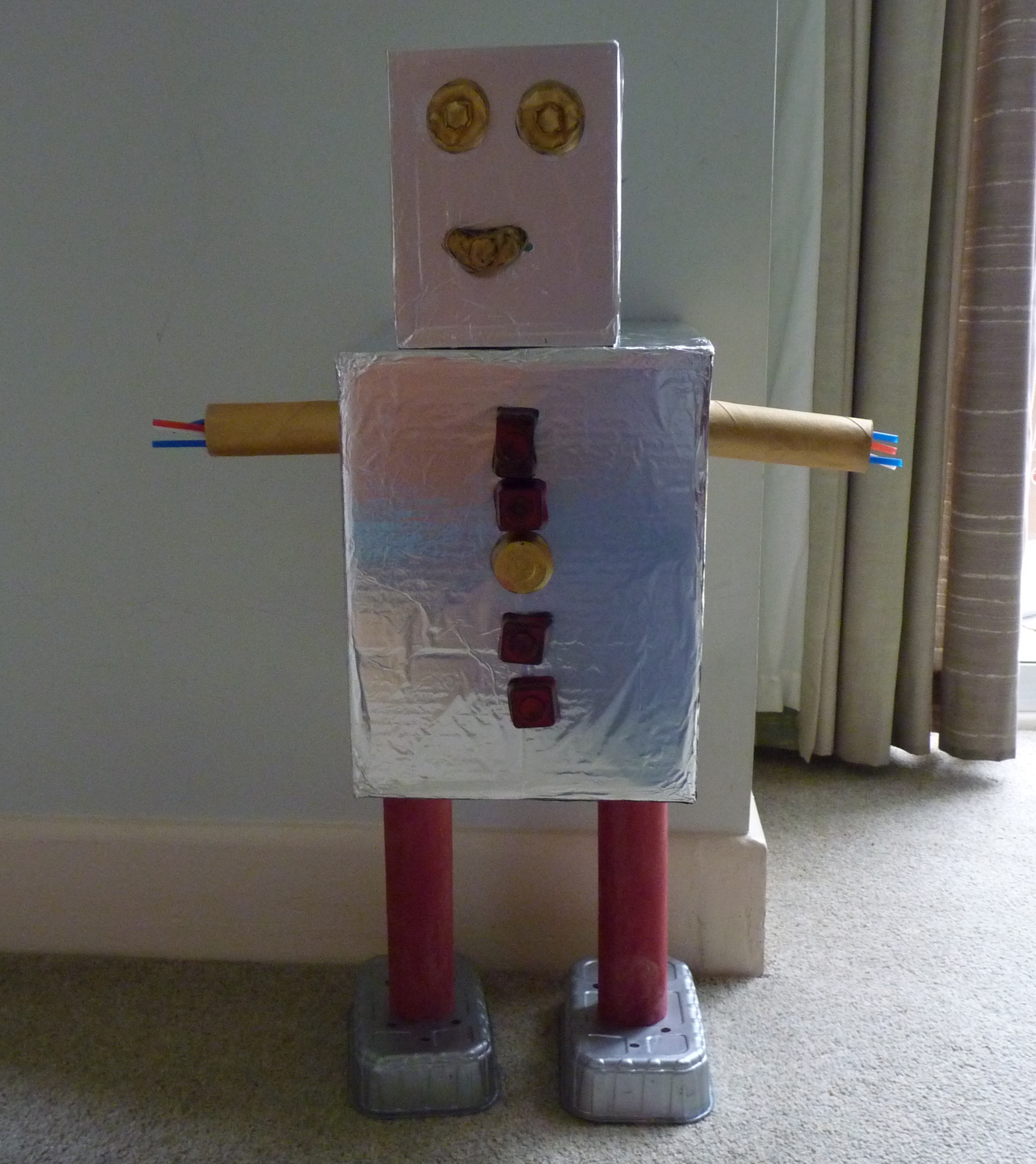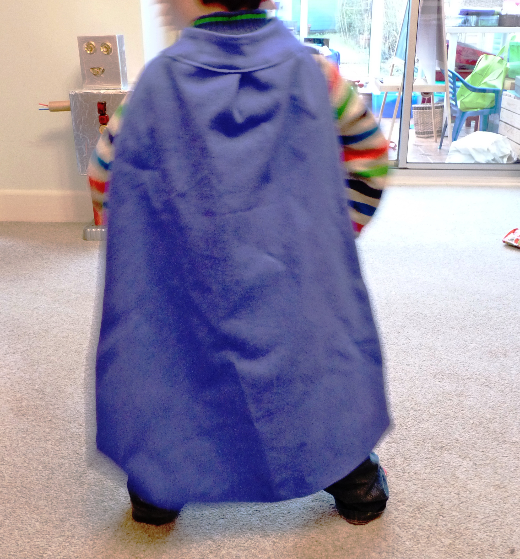 Since I was last here I have: started sewing presents for my brother’s baby, due in June (no pictures yet, as they do occasionally read my drivel!!); made Niblet a cardboard guitar for his current craze of air guitaring to ACDC; built a robot with Niblet (called Roddy, who is sadly demised due to limbs falling off each of the many times he has been knocked over!!); helped Niblet make a hat to wear to nursery for Red Nose Day; knocked up a quick superhero cape for Niblet, using the leftover fabric bought for my nephew’s cushion and an old shirt of Hubbie’s (he is now a sartorial superhero!!)