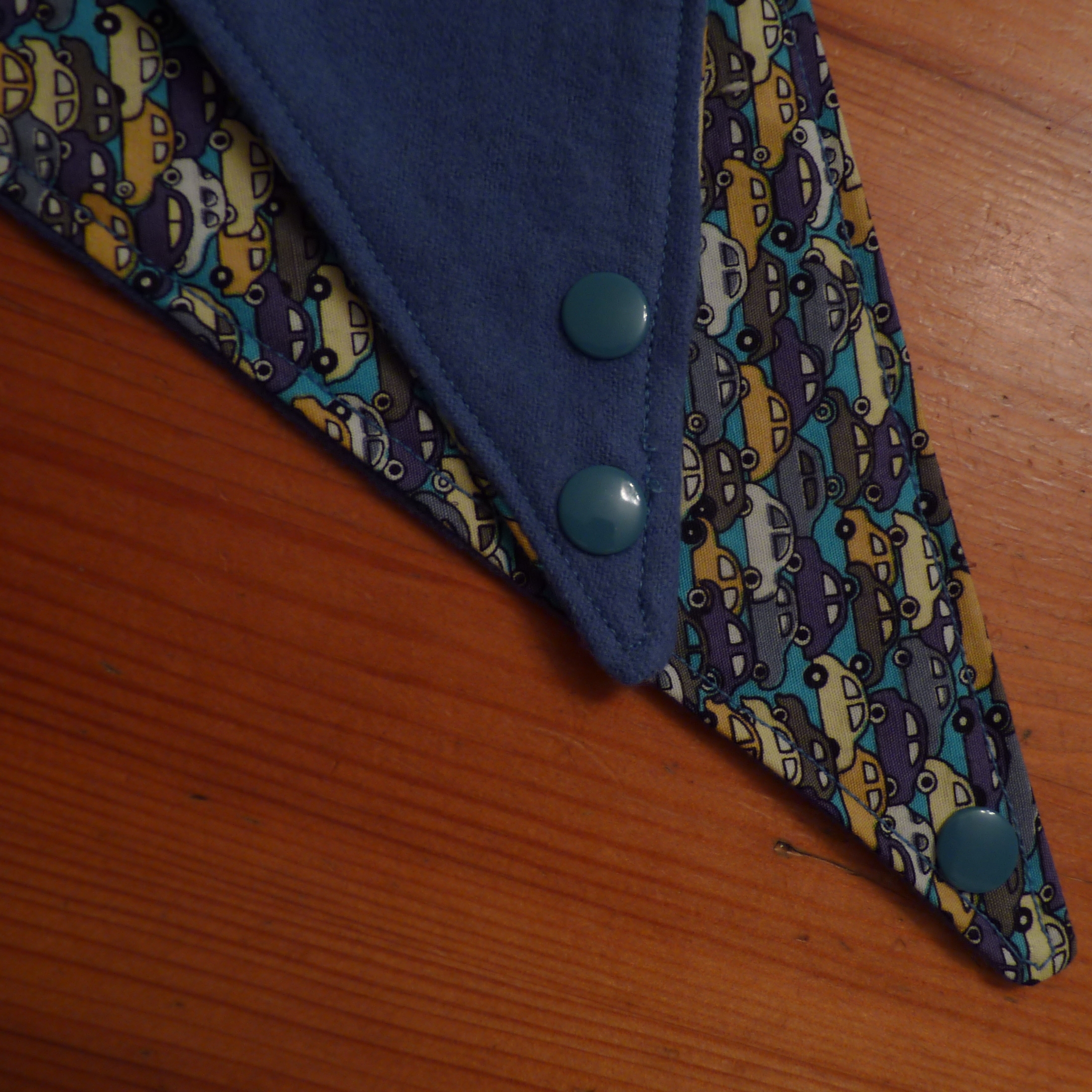 The ‘boy’ bibs are all made with the flannel/winceyette backing, which makes them a lot less bulky and much softer. I had been waiting for some more KAM snaps to arrive and had also been trying to source a blue KAM snap that would match the blue backing fabric. Many people sell navy or royal blue, but I needed something a bit more ‘denim blue, which came in the form of sea blue from a lovely man on Ebay. Ta-daah!
