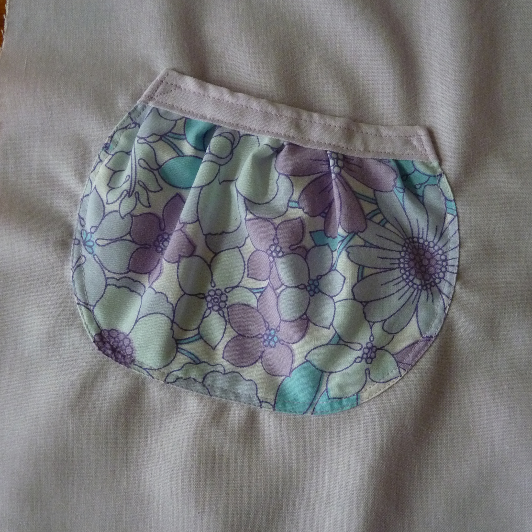 So far I have sewn up the patterned side and put pockets on the front of the plain side. I think the pockets may have been a little ambitious (again no pattern or instructions – just made them up) and they are not exactly the same size or even completely level. I think that may be easier with a rectangular patch pocket, maybe next time.